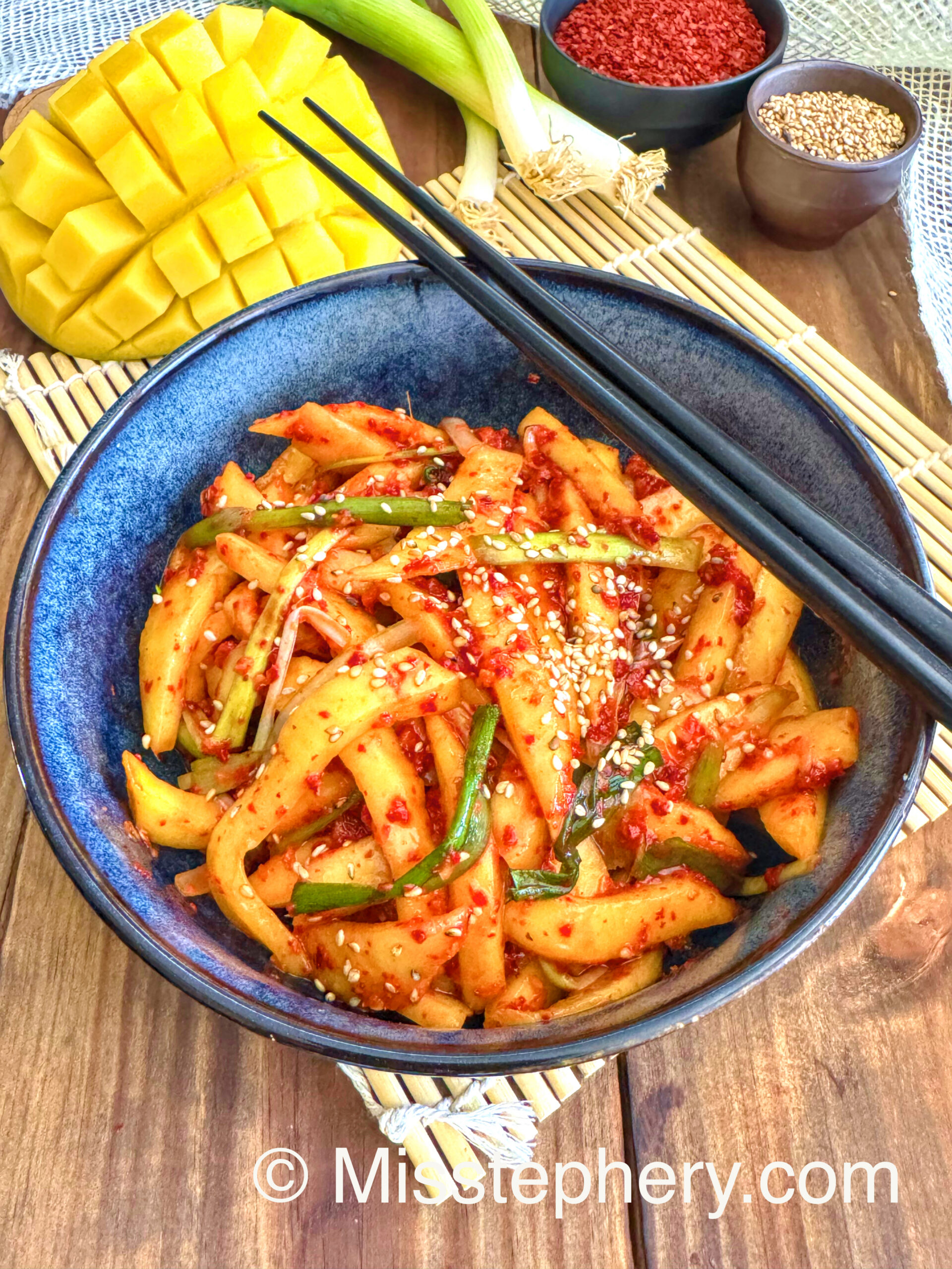 Attention toutefois, la mangue est un fruit délicat. Je vous conseille de consommer ce kimchi dans les 2 à 3 jours après la fermentation (5 jours maximum au total). Au-delà, la texture risque de devenir trop molle, voire « compotée », et le goût pourrait devenir trop acide en raison du sucre naturel du fruit qui se transforme en acide (ou dégage une légère note alcoolisée).